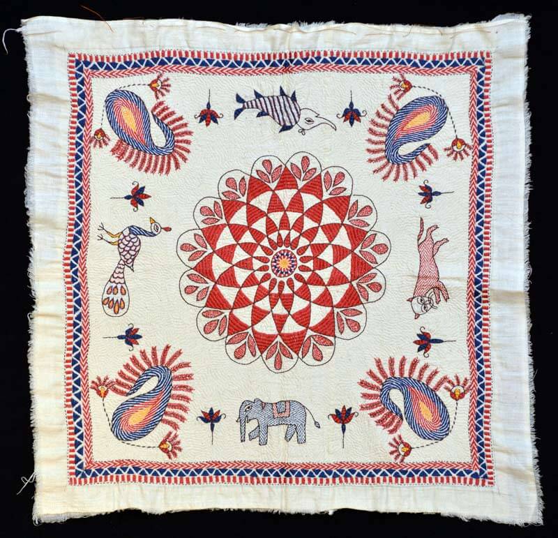 Kantha of Bengal uses the running stitch throughout the entire piece. The stitches hold the fabric layers together and it serves the functional and decorative purpose. Kantha also recycles the old textiles and makes a new fabric. The artisans here work without patterns and create designs from the memory and cultural knowledge.
